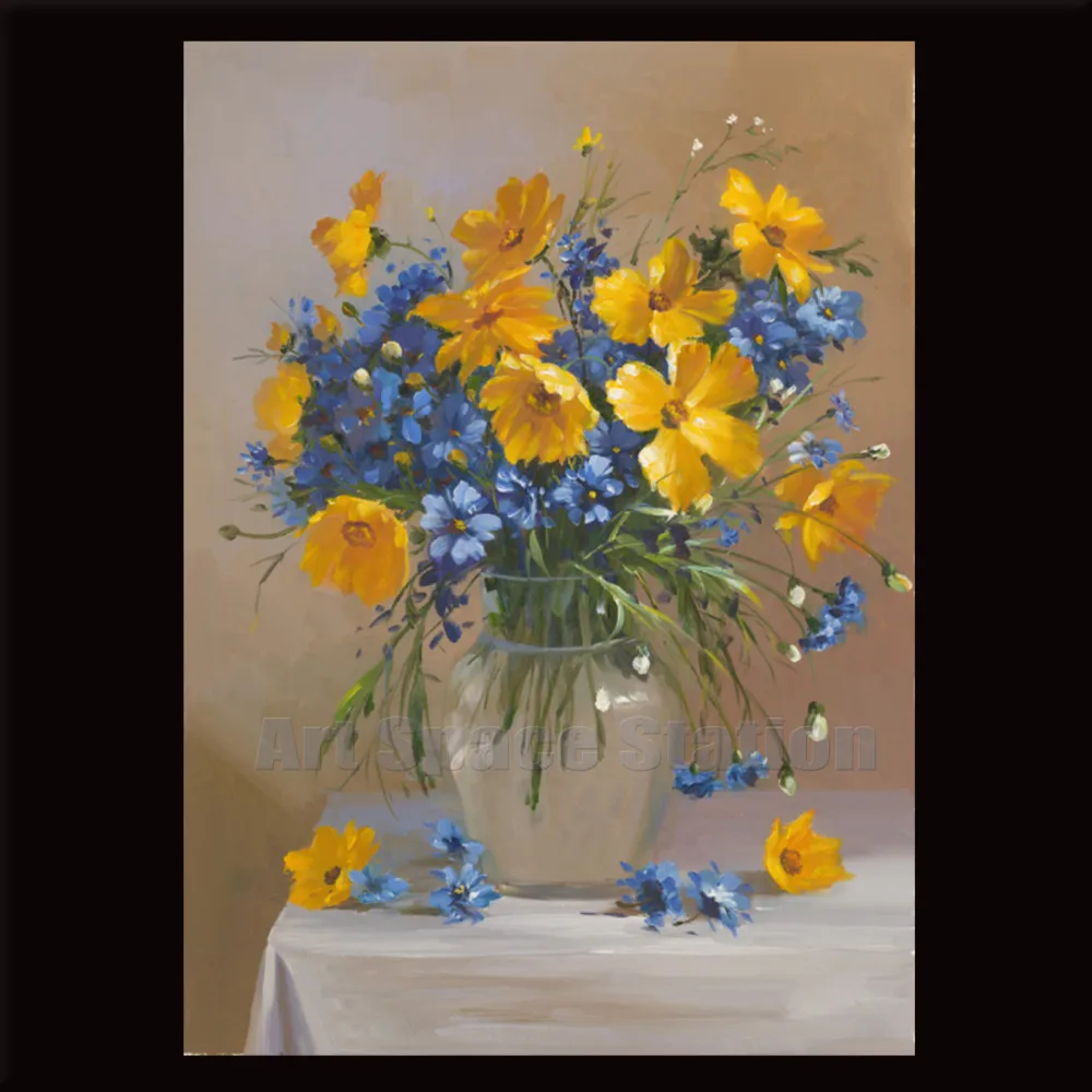 Blue Yello Wild Daisy Oil Painting on Canvas Modern Floral Vase Picture Large Flowers Canvas Wall Art Home Decoration 20x28inch