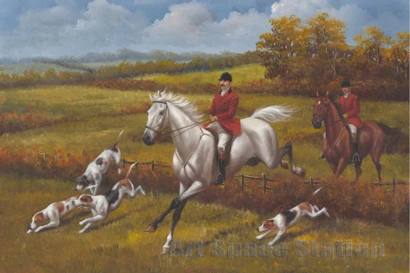 Hunting Dog Oil Painting Running White Horse Vintage Animals Art on Canvas for Living Room Home Decoration 24×36 inch
